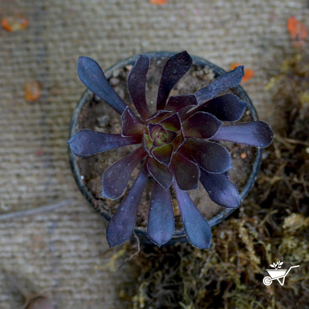 Aeonium arboreum Zwartkopf is a striking succulent with clumps up to 3 feet (90 cm) tall gray-brown stems that often branch near their base. The long, bare stems hold large terminal rosettes (up to 8 inches/20 cm in diameter) of very dark purple, almost black leaves. Large conical clusters of bright yellow star-shaped blooms.