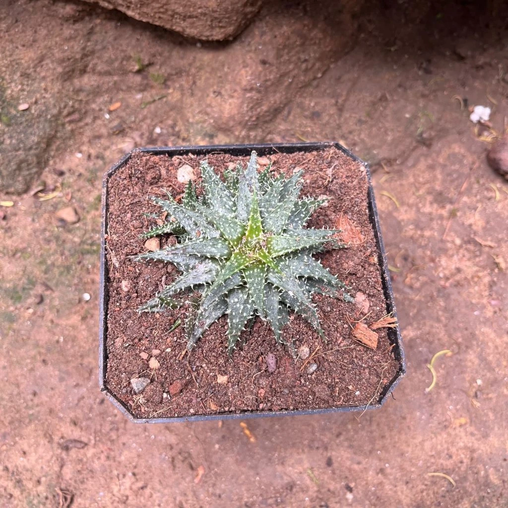 Aloe ‘Pepe‘ is a dwarf succulent that forms rosettes of fleshy, triangular, dark green leaves with soft white teeth along the margins and white spots growing with additional teeth on both surfaces, producing individual rosettes about 2 inches in diameter, with numerous offsets of similar size