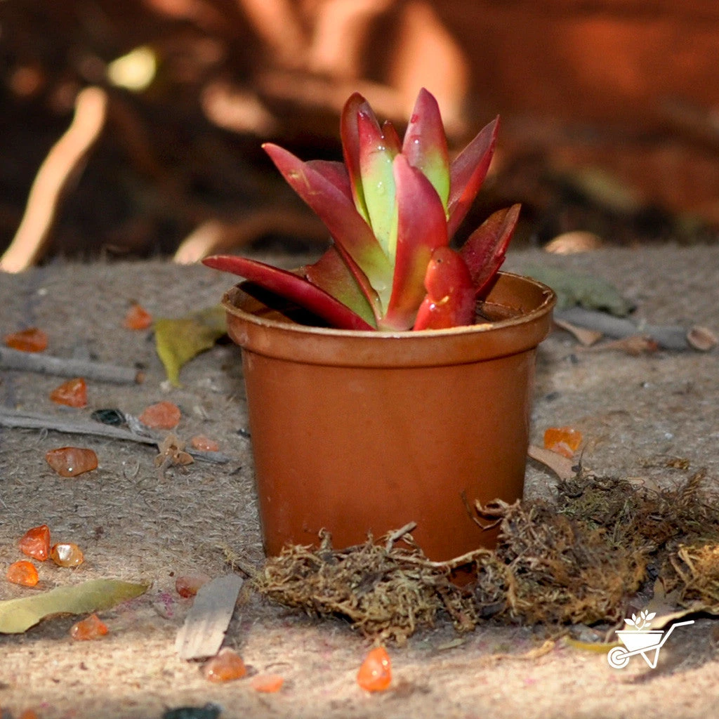 Crasulla Campfire or Red Flames is a branching succulent plant with fleshy propeller-like leaves that mature from light green to bright red.. Leaves turn bright red if not over-watered and the plant receives direct sun for most of the day, during drought or in cold temperatures. This crassula gets tiny white flowers on upright, 6 to 8 inch stalks in early spring. When grown in shade, the leaves are bright apple green most of the year