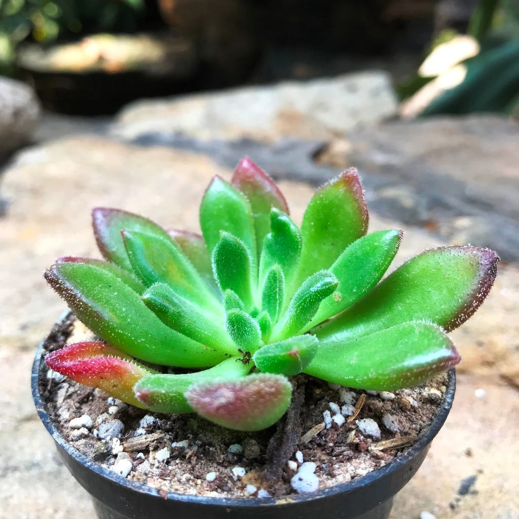 Echeveria ‘Doris Taylor‘ is a hybrid between Echeveria pulvinata ‘Ruby’ and Echeveria setosa. Echeveria . Also called the woolly rose plant, is an attractive pale green succulent plant. The leaf tips of this echeveria are sometimes dark and leaves are covered in fine white “hairs” that give it a fuzzy appearance. It has a charming rosette shape reaching 7 to 8 inches (18-20 cm.) around and just 3 to 5 inches (7.6-13 cm.) tall. When happily stressed, the tips of the leaves turn a dark red.