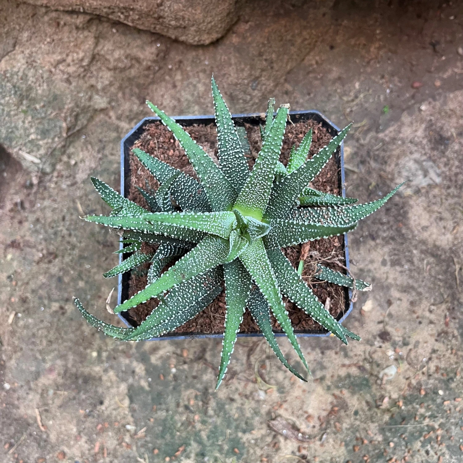 Haworthia attenuata var. radula is a clumping, slow growing upright succulent. This variety has long, flattened leaves covered on both sides by lots of tiny, white bumps. It will bloom in spring or summer with small white flowers.