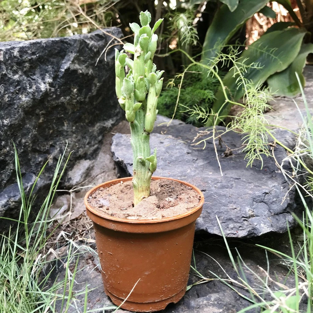 Monadenium Ellenbeckii is a perennial succulent that does not grow very tall. It has serpent-like stems that emerge from a central base. the stems are thin bright/light green, fleshy, columnar or creeping, and shortly rhizomatous. Several to 50 cm or up to 1,5 m long when supported, few branches, up to 15 mm , with 4 longitudinal grooves below.Forms many stems that emerge from the base giving it the name Octopus Arms. The arms can grow from 1.5′ up to 3 or 4 feet if supported. Flowers are a yellow-green color and appear in the summertime.