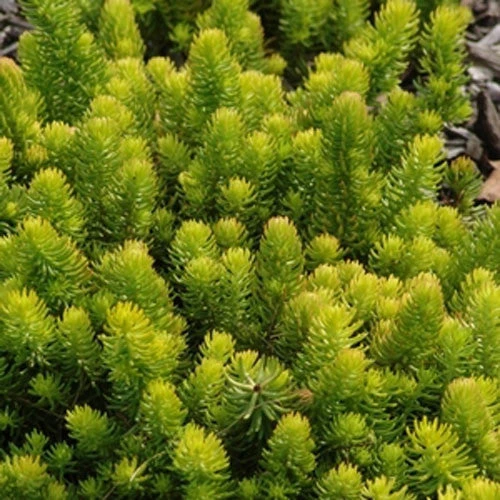 Sedum reflexum shines with brillant golden-yellow foliage. It is low growing, mat forming with needle-like evergreen leaves that look like a yellow, miniature spruce. The drooping buds face upward when they open. It grows to 4 inches tall and 2 feet across. Yellow flowers appear in late summer.